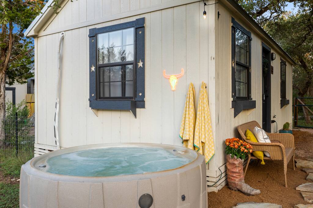 The George is located on a property with 3 other cabins. It features one full-sized bed, kitchen, pullout couch, TV, AC, personal grilling & firepit area. On Texas Time Properties has 4 cabins on site. They are spread out on the property giving you and your guests space to your own. 📍 Close to Everything You’ll Love 5 min → Frontyard Brewery 🍺 5 min → Willie Nelson’s Luck Ranch 🎶 15 min → Pace Bend State Park 🌲 35 min → Downtown Austin 🎉 💪 Shared Resort-Style Amenities: - Full gym (2 weight racks, free weights, Peloton Bike & Treadmill) - Hot tub, sauna, & invigorating cold plunge - Refreshing outdoor shower - Private two-level dock with lake access - 2 paddle boards included for your adventure Traveling with Children: Sanitized toys and pack-n-play available. Need advanced notice if requested. Pets allowed. $50 pet fee and $25 for each additional pet. Fun Add-Ons to Make Your Stay Extra Special 💕 Romantic or Birthday Celebration Packages 🚤 Retro Boat Cruise 🌅 Captained Boat Ride (Daytime or Sunset) 🎬 Movie Night Under the Stars 👉 Ask us for details and we’ll help you plan the perfect experience!