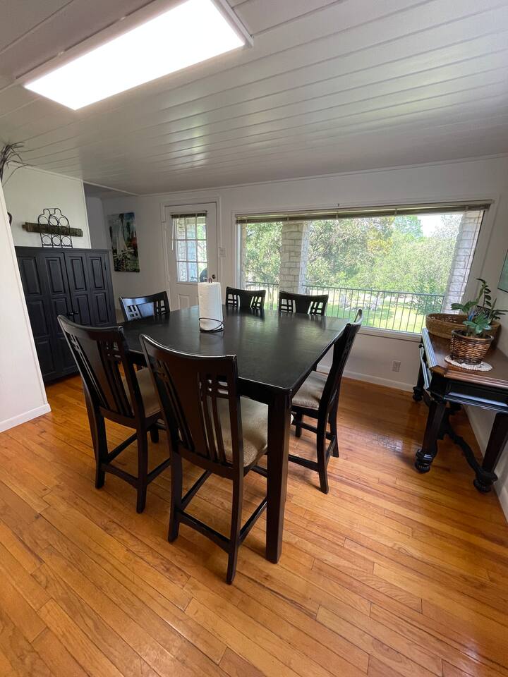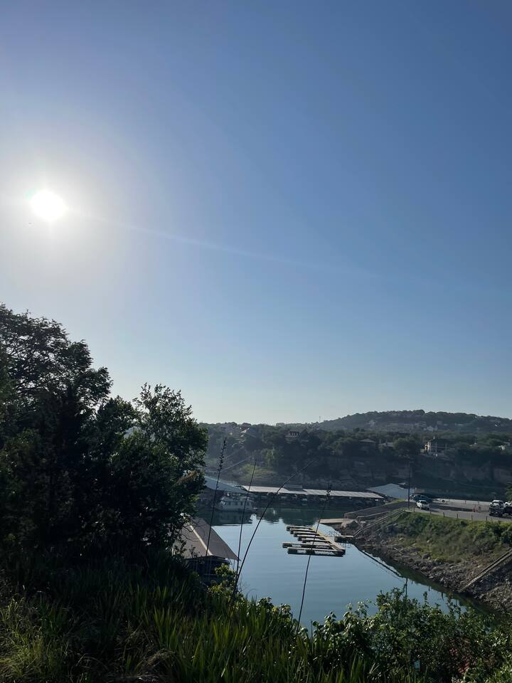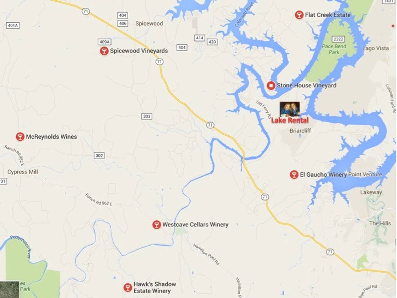 The kitchen is fully equipped with a dishwasher, microwave, coffee maker, coffee grinder, oven, stove, refrigerator, and dining room. You'll find plenty of glassware, plates, pots, pans, and spices. THINGS TO DO While there is no direct lake access from here, access to the Marina to launch and store your boat is a short 4 minute walk away. We are located within a 20 minute drive to several award winning Texas Hill Country wineries. For those looking to enjoy beautiful hiking and biking trails in the hill country you won't want to miss Reimers Ranch and Hamilton Pool located just 30 minutes away. We are located less than 2 miles from Pace Bend Park. There are several nearby restaurants and multiple convenient stores for various provisions and a local farmers market every Sunday! The Marina right in the cove offers boat launch access, boat/jet ski rentals and emergency services for an added convenience. The Hill Country Galleria is nearby offering some of the best retail shopping, fine dining restaurants and family-friendly events. THE NEIGHBORHOOD This is a relaxed yet upbeat lake community filled with a blend of vacation homes and longterm permanent local residents who have passed the homes down several generations. You'll need your own vehicle to get around. Some popular destinations from the cottage are-- Krause Springs - 15 minutes Cypress Valley Canopy Tour -- 10 minutes Stonehouse Vineyard -- 15 minutes Spicewood Vineyards -- 15 minutes Blissful Hill Wedding Venue -- 10 minutes (or 2 minutes by boat) El Gaucho Winery -- 15 minutes Hamilton Pool -- 30 minutes Golf Courses: Lakecliff Country Club -- 15 minutes Austin Golf Club -- 10 minutes Barton Creek Lakeside -- 15 minutes Horseshoe Bay Resort -- 30 minutes Texas Towns: Marble Falls/Horseshoe Bay -- 30 minutes Bee Cave -- 20 minutes Austin -- 35 minutes Fredericksburg -- 1 hour Burnet -- 40 minutes Dripping Springs -- 30 minutes Wimberley (Blue Hole, Jacob's Well, Town Square) -- 40 minutes