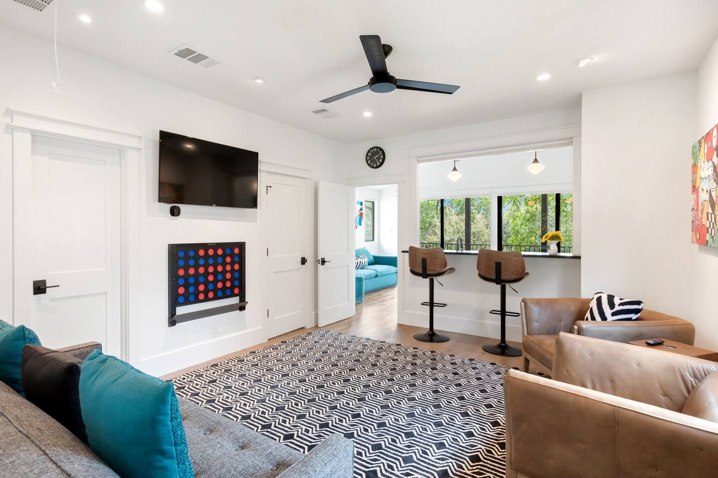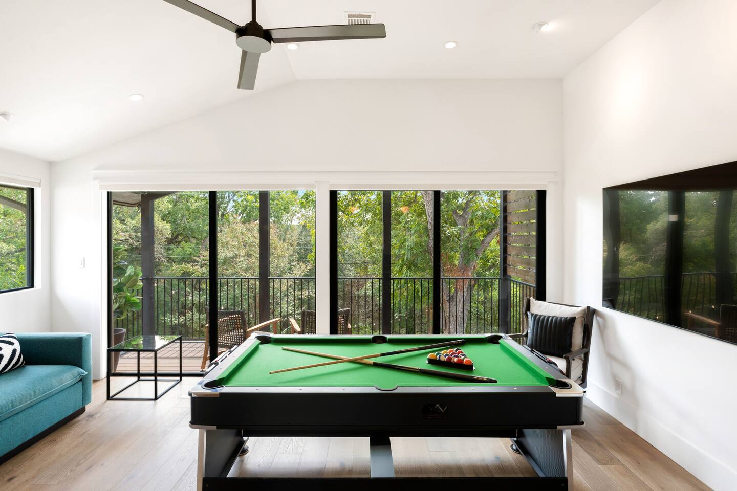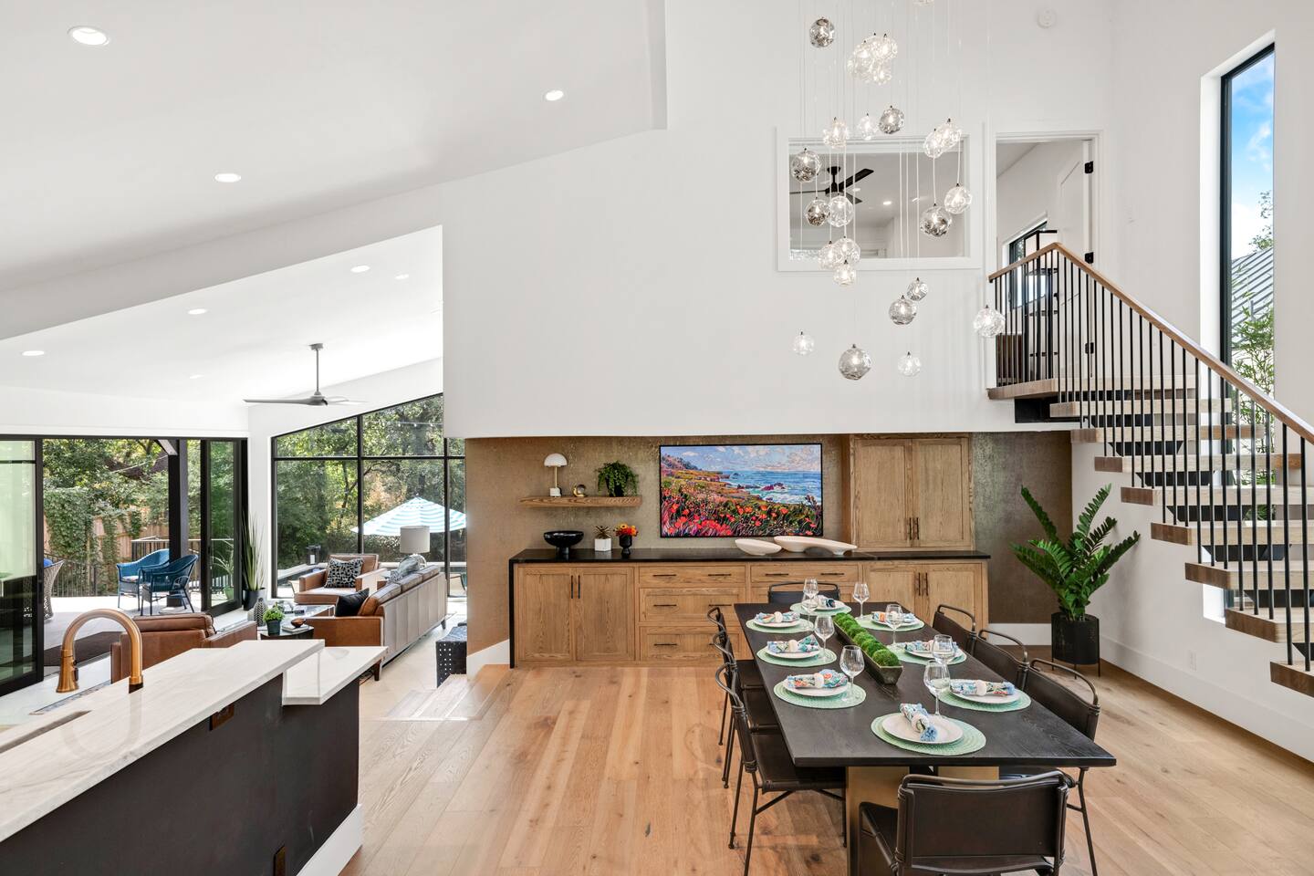 We invite you to create your own memories at this luxe retreat perfect for corporate groups, families or a rendezvous with friends. Tall ceilings plus big picture windows help the space feel spacious and bring in the outdoors. This home is the ultimate combination of luxury, comfort, and convenience. Please note this home is NOT suitable for parties, events, or bachelor parties. OUTDOOR LIFESTYLE Your group will fall in love with this backyard oasis complete with luxury outdoor kitchen, living, dining, and 6' deep saltwater pool (option to heat the pool)! Enjoy BBQs in the fully equipped outdoor kitchen featuring a propane grill, outdoor refrigerator, ice maker and ample seating for sharing meals on the patio. After an eventful day in Austin, gather your group to relax poolside while enjoying tunes from the Sonos sound system. The outdoor living area has a fireplace for cozy nights by the fire with a glass of wine. A large TV with Netflix, Amazon Prime, YoutubeTV sits just above the fireplace. The backyard feels like a sanctuary as it backs into lush foliage from old shade trees and tall ivy fencing on either side for a private escape. Whether you’re looking to gather or retreat, you’ll find your happy place here. COMFORTABLE & SPACIOUS INTERIOR This home boasts a modern and bright décor throughout. The eat-in kitchen is fully equipped with a convection stove, double oven, warming drawer and wine fridge, and everything you'll need to comfortably prepare meals. For formal group dinners, gather your group around the dining table for a good meal and good conversation. The family room living area overlooks the pool and backyard and features plush leather seating for gathering to watch Netflix, Prime or YouTubeTV. There is a formal living area as well, with large windows which frame huge oak tress and provide a beautiful space for conversation or quiet reading. Bedroom 1: The Primary - King bed with full en suite bathroom, seating area, in-room TV and private deck overlooking the pool and backyard. Bedroom 2: The Second Primary - King bed with full en suite bathroom, and in-room TV. Bathroom has walk-in shower & soaking tub. Bedroom 3: Queen bed with full en suite bathroom, in-room TV Bedroom 4: Queen bed with full en suite bathroom, in-room TV Bedroom 5/6: Game Room Flex Space - Each comfortable pullout queen bed is in a separate space which can be closed off for privacy from the other. Private bathroom. As a game room, there is a game table for pool or air hockey and other games. This space as an 85" TV and a private deck overlooking the pool & backyard. All our bathrooms are well-stocked with plush towels and toiletries. Pool towels are also available. Additional amenities include a washer/dryer, complimentary Wi-Fi, a Pack ‘n Play, and a pool safety gate. Free parking in driveway and on the street. Pool can be heated during the cooler months at an additional cost. Inquire for details. CONVENIENT LOCATION You wouldn’t believe you’re just 8 minutes from the hustle and bustle of Downtown Austin. Located in one of Austin’s most highly coveted neighborhoods, Tarrytown, with elegant houses and peaceful parks. Just a few minutes’ walk will lead you to Lake Austin where you'll find a variety of restaurants and coffee shops overlooking the water. If you want a fun day out on the lake, bring your boat! The public boat launch for Lake Austin is just down the road. **ACL is just 3.8 miles away!