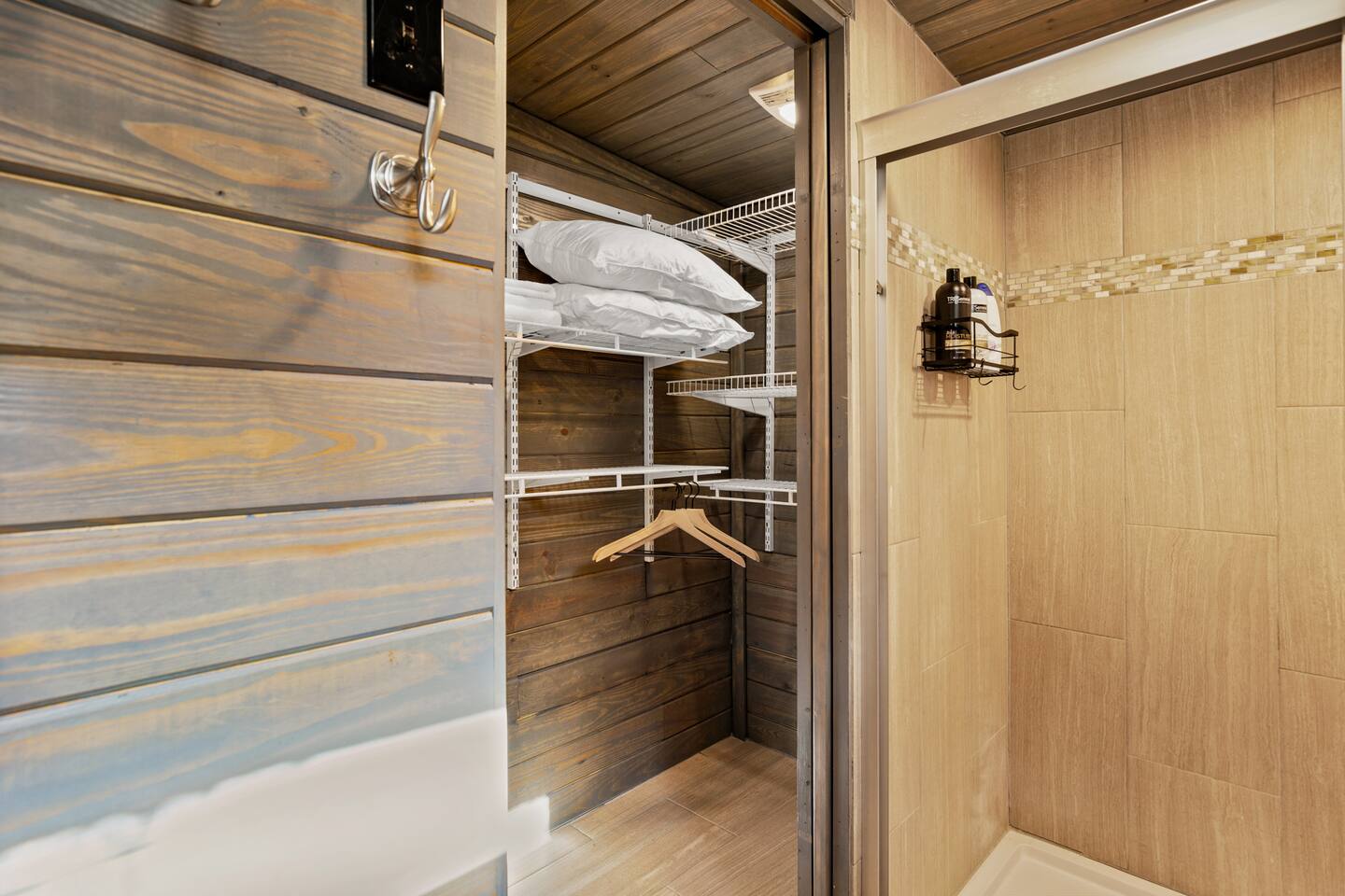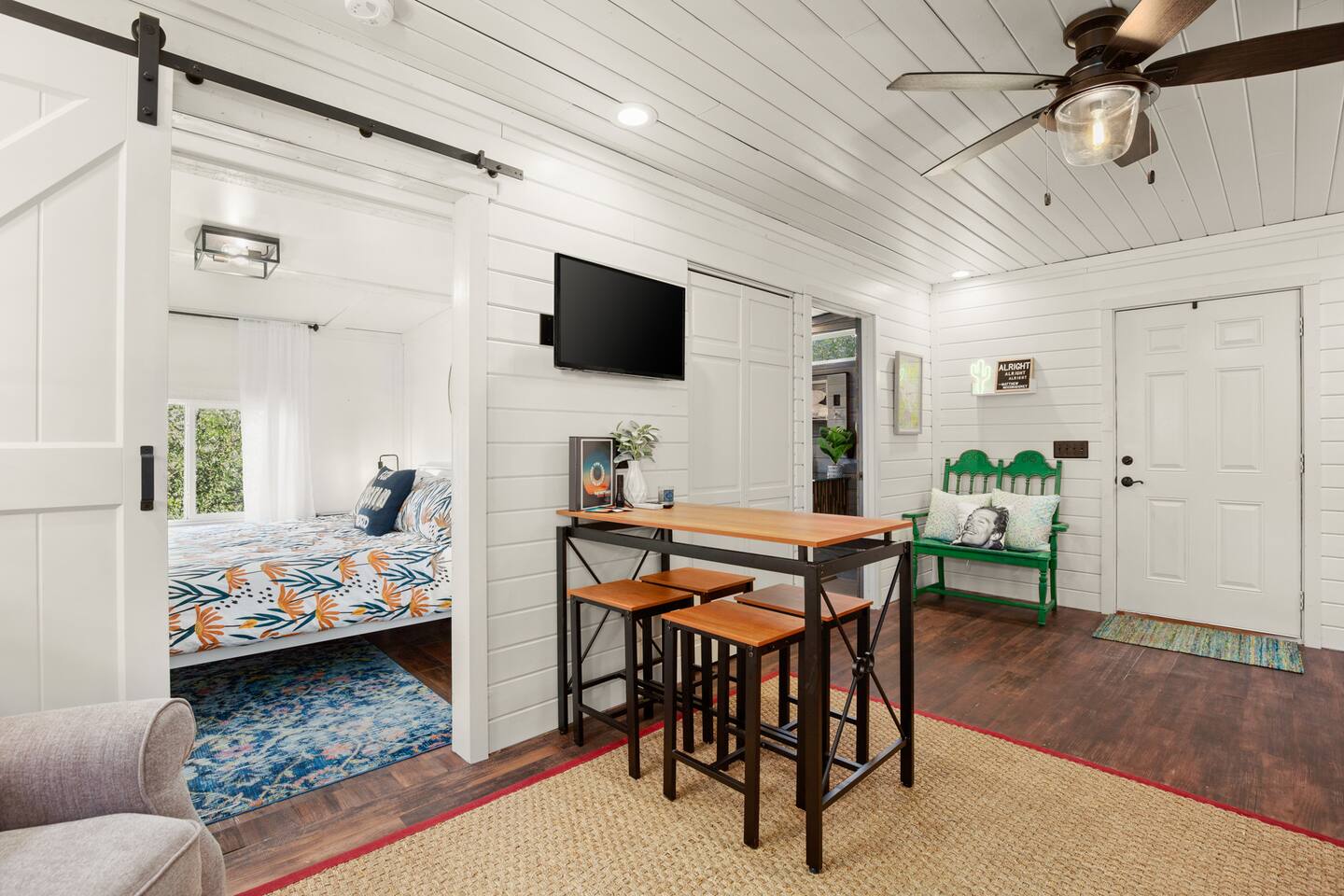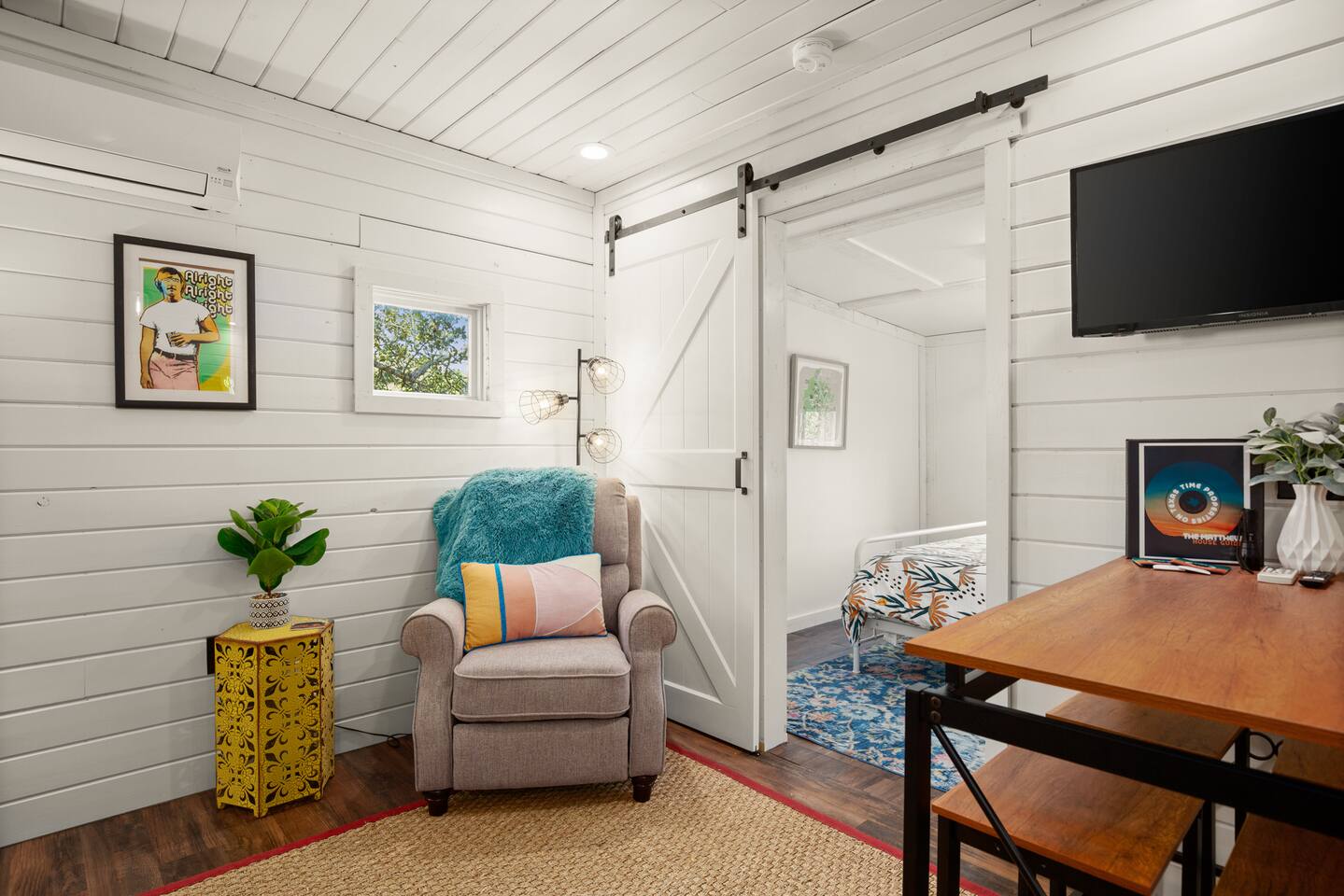 The Matthew is located on a property with 3 other cabins. It features one king bed, kitchen, pullout couch, TV, AC, personal grilling & firepit area. On Texas Time Properties has 4 cabins on site. They are spread out on the property giving you and your guests space to your own. 📍 Close to Everything You’ll Love 5 min → Frontyard Brewery 🍺 5 min → Willie Nelson’s Luck Ranch 🎶 15 min → Pace Bend State Park 🌲 35 min → Downtown Austin 🎉 💪 Shared Resort-Style Amenities: - Full gym (2 weight racks, free weights, Peloton Bike & Treadmill) - Hot tub, sauna, & invigorating cold plunge - Refreshing outdoor shower - Private two-level dock with lake access - 2 paddle boards included for your adventure Traveling with Children: pack-n-play available. Need advanced notice if requested. Fun Add-Ons to Make Your Stay Extra Special 💕 Romantic or Birthday Celebration Packages 🚤 Retro Boat Cruise 🌅 Captained Boat Ride (Daytime or Sunset) 🎬 Movie Night Under the Stars 👉 Ask us for details and we’ll help you plan the perfect experience!